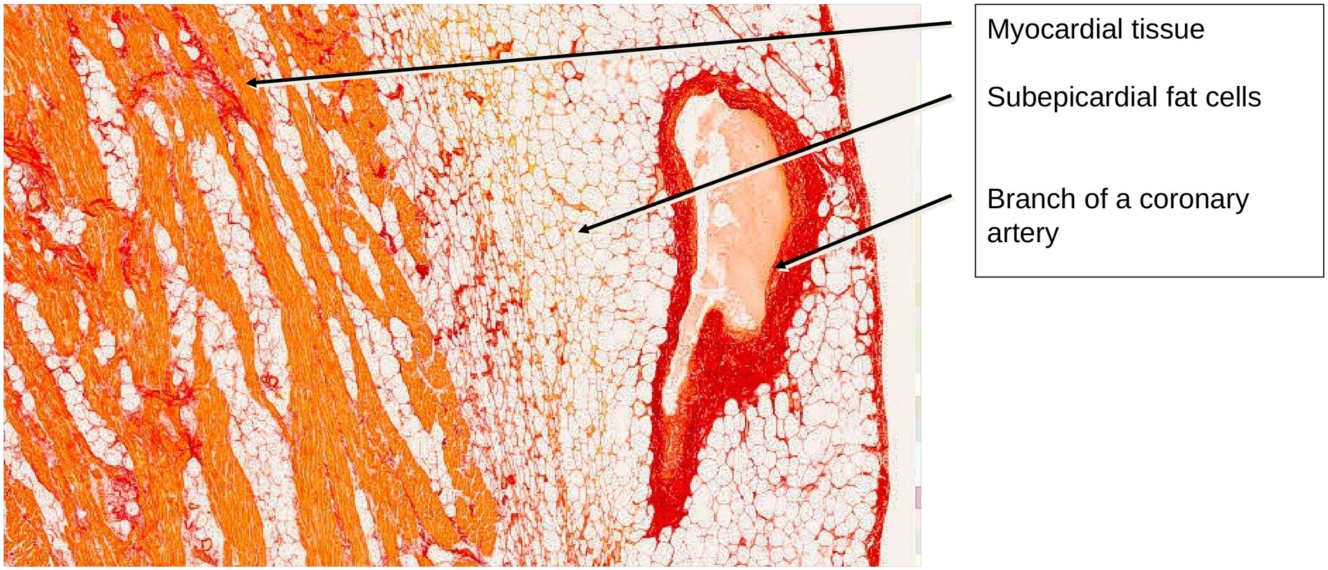 Externally, the myocardium is covered by the epicardium. In certain areas, a layer of adipose tissue is present between the epi- and myocardium. This is especially prominent near the coronary arteries and their branches, which are embedded within epicardial fat.