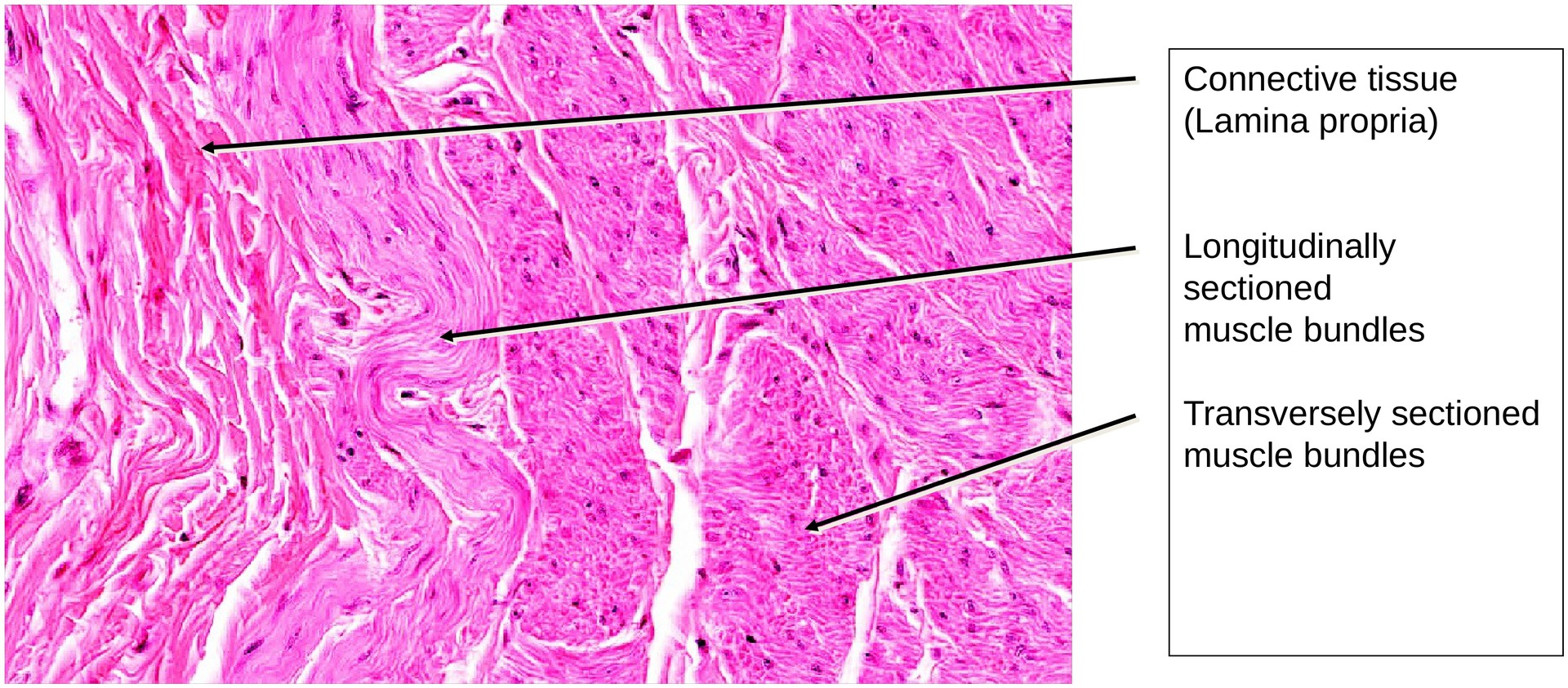 • Examine the tunica muscularis and attempt to recognize the three principal orientations of the smooth muscle bundles (note that not all are present in every region of the section).